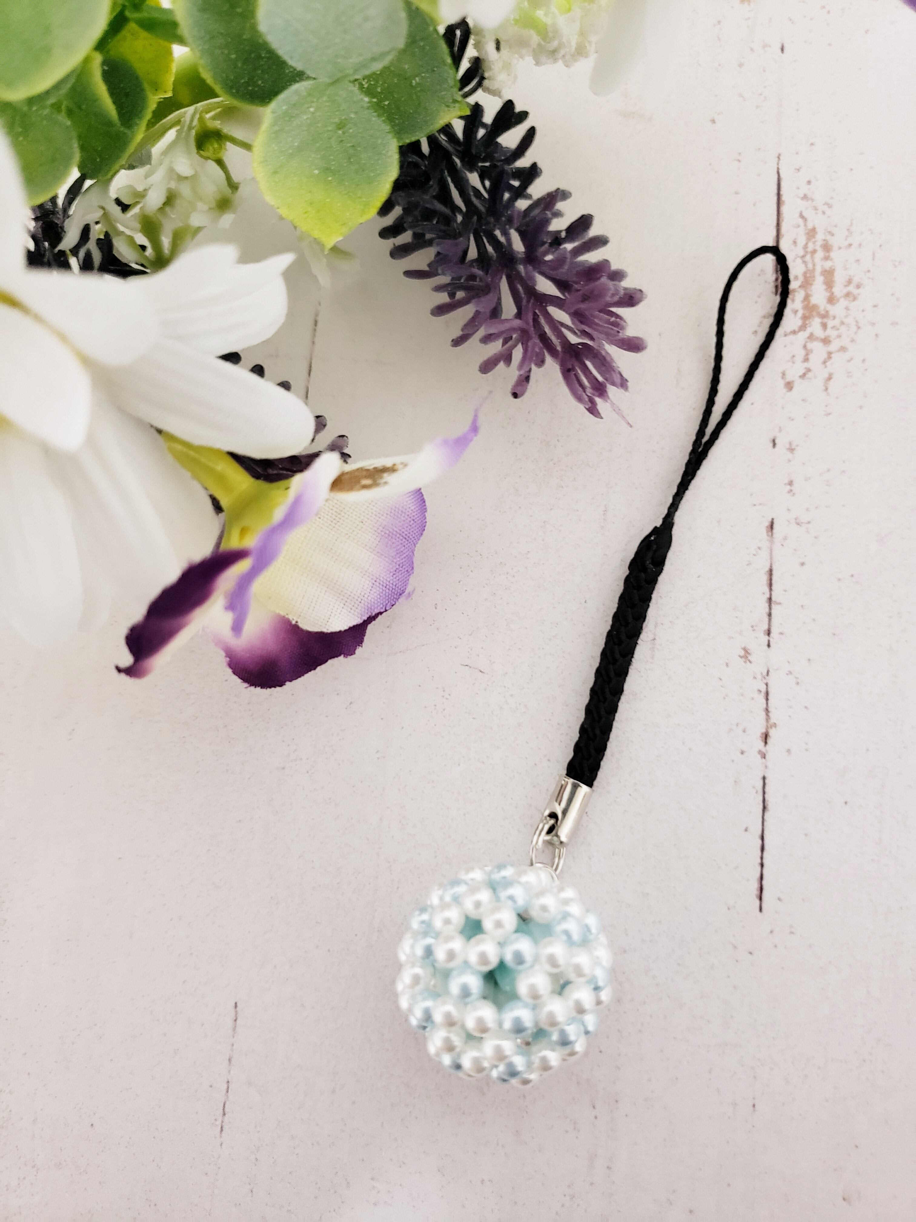 パール調フラーレン/ホワイト×スカイブルーラリマーさざれ石5粒入りストラップ