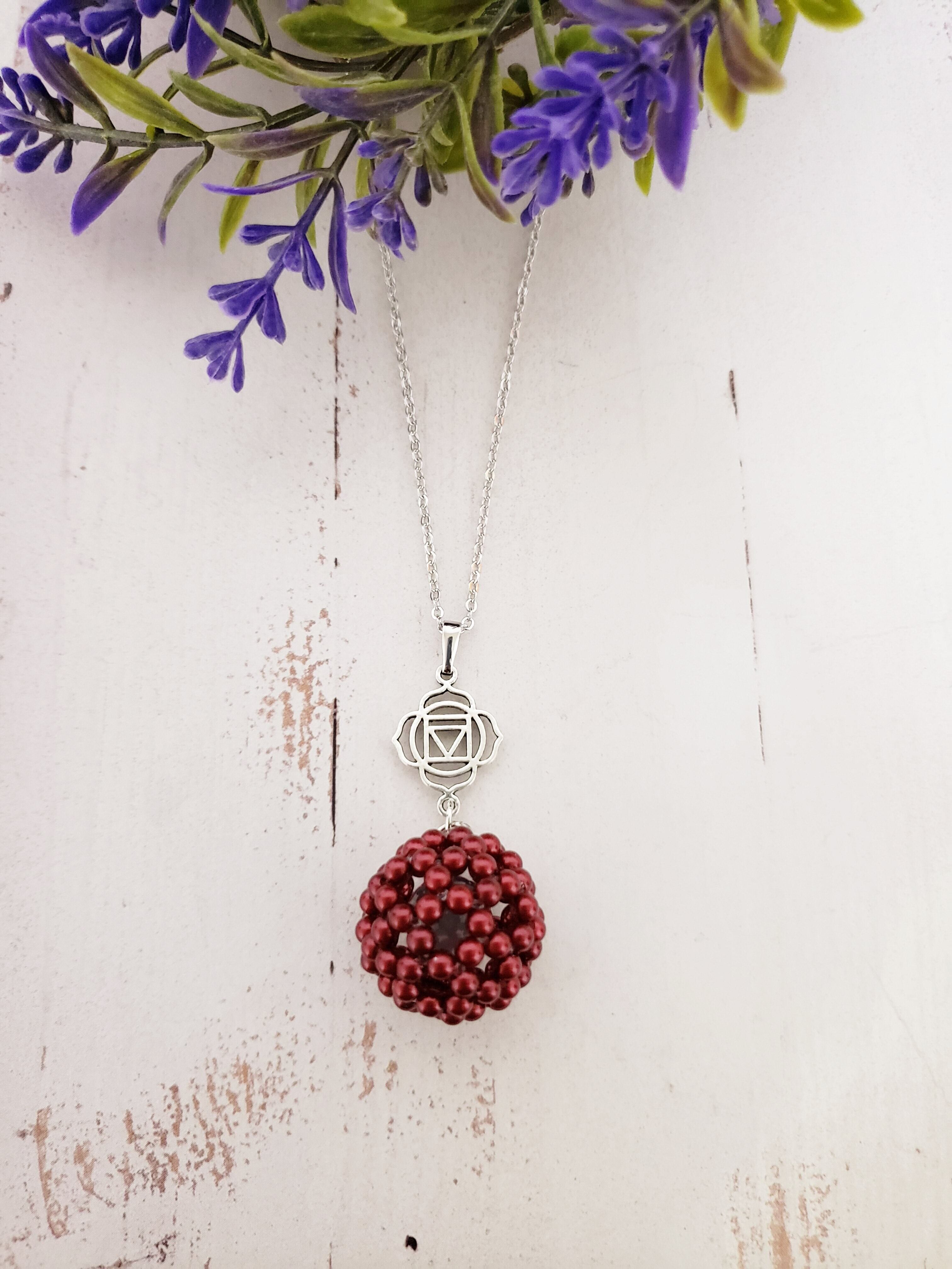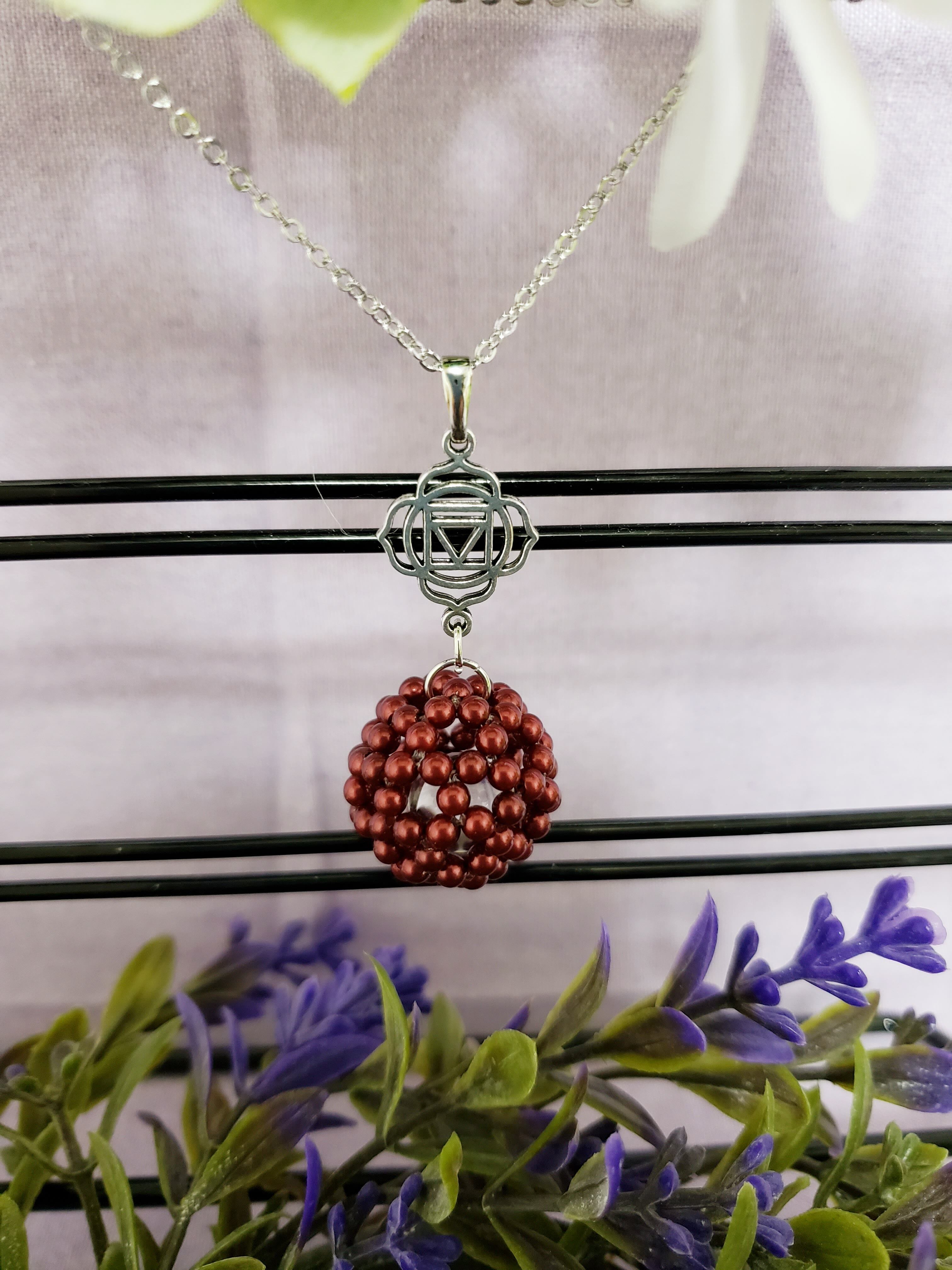 パ-ル調フラーレン/天然石水晶入り第1チャクラネックレス アメリカンチェリーカラー