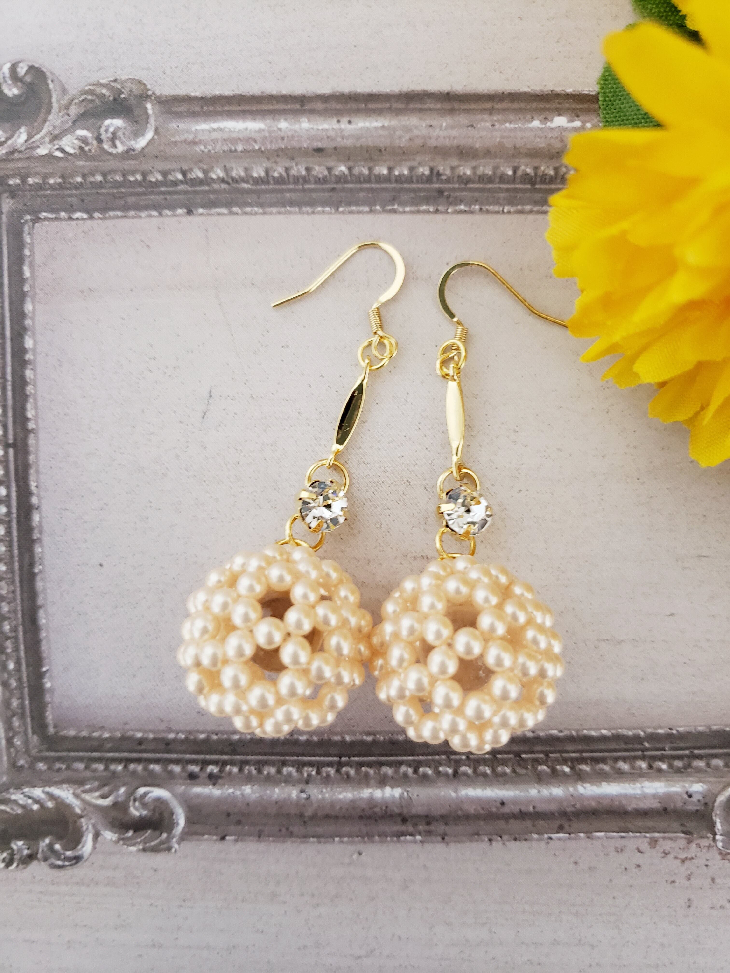 パ-ル調フラーレン/天然石水晶入りピアス ハニーゴ-ルド