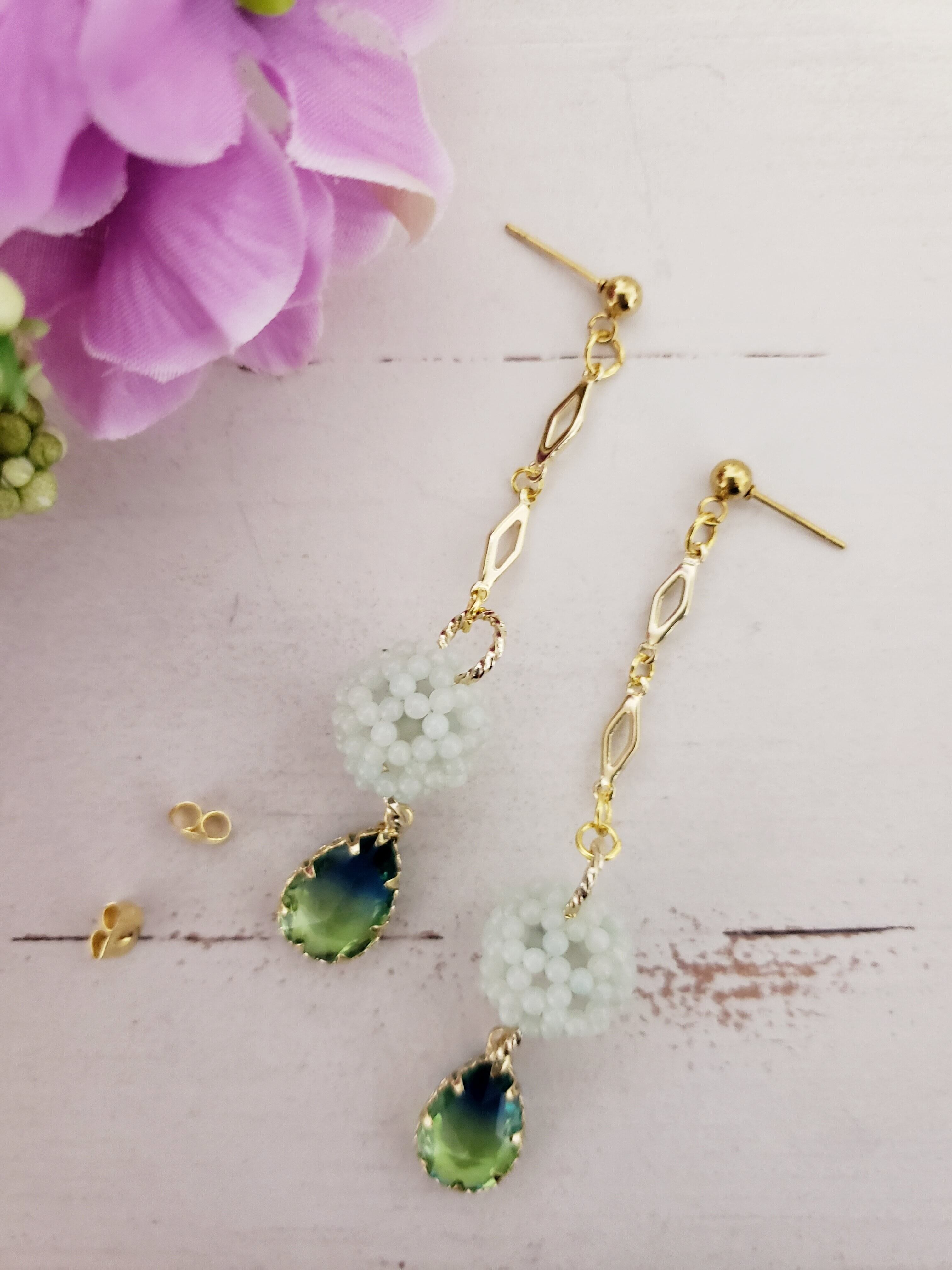神聖幾何学フラーレン/アマゾナイト2㎜玉 雫チャ-ム付きピアス