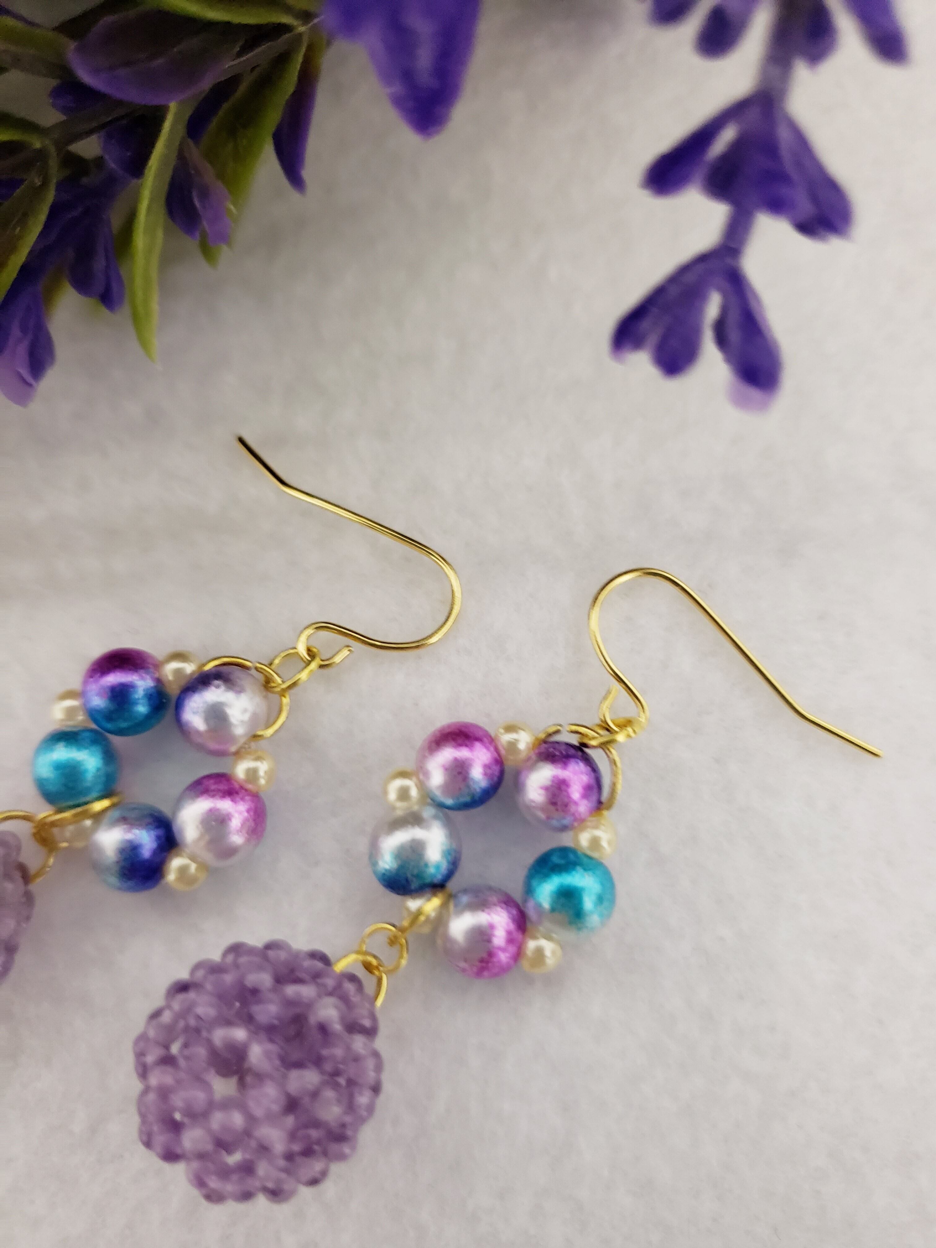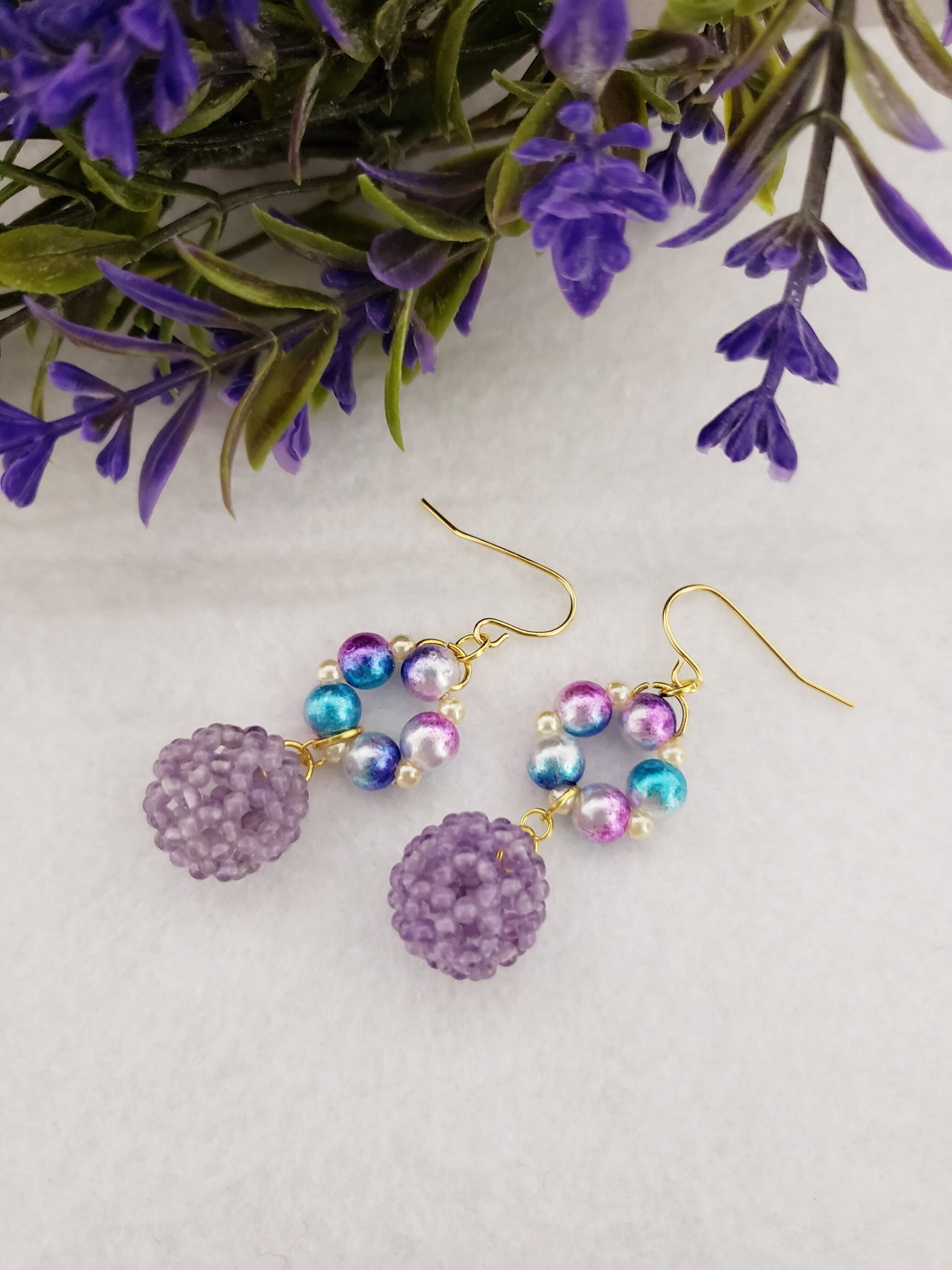 神聖幾何学フラーレン/アメジスト2㎜玉マ-ブルチャ-ム ピアス