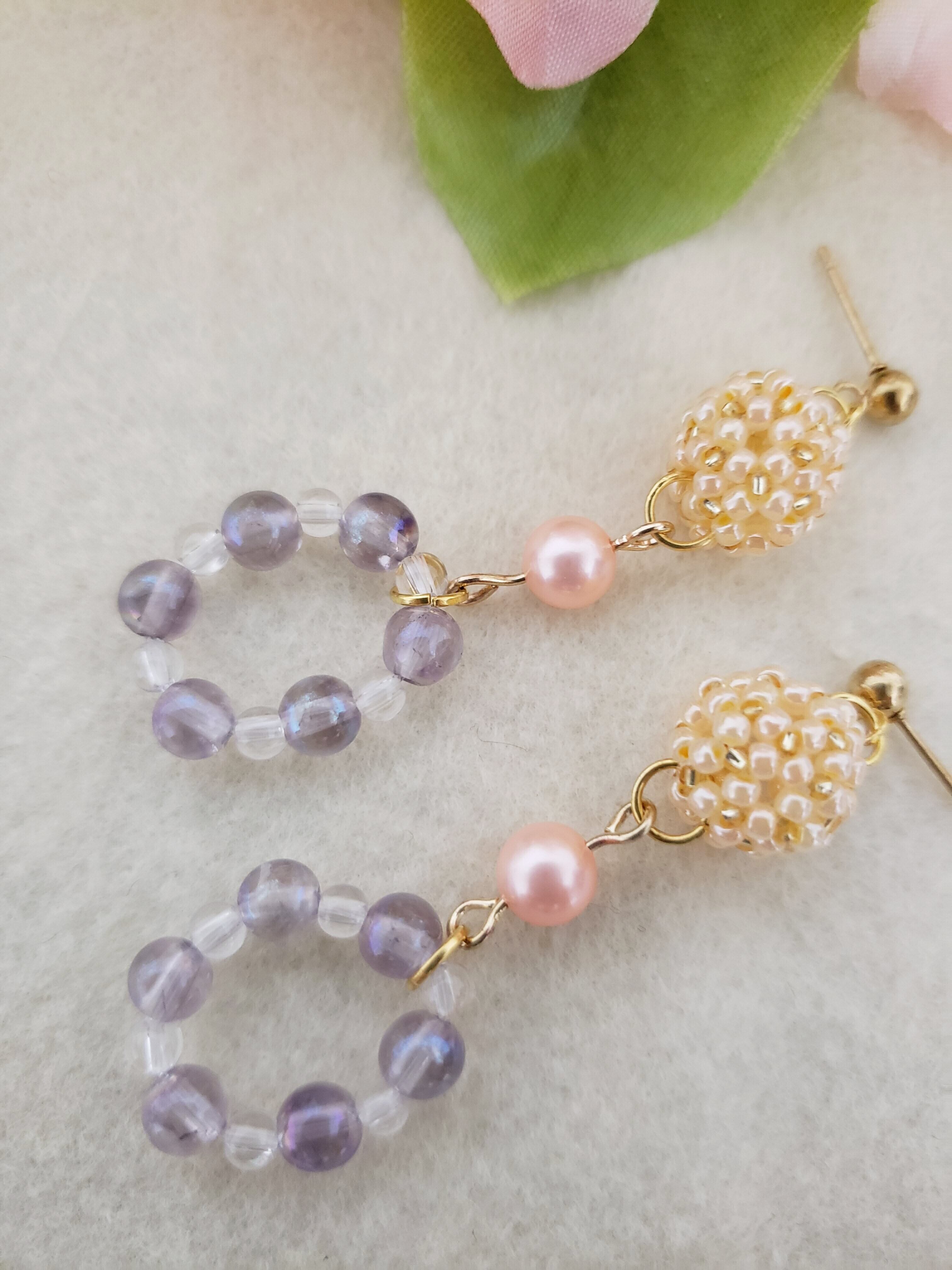 シ-ドビ-ズのボ-ル形に人気の天然石ラベンダーアクアオ-ラ&水晶の可愛らしいチャ-ムをつけたピアス♪