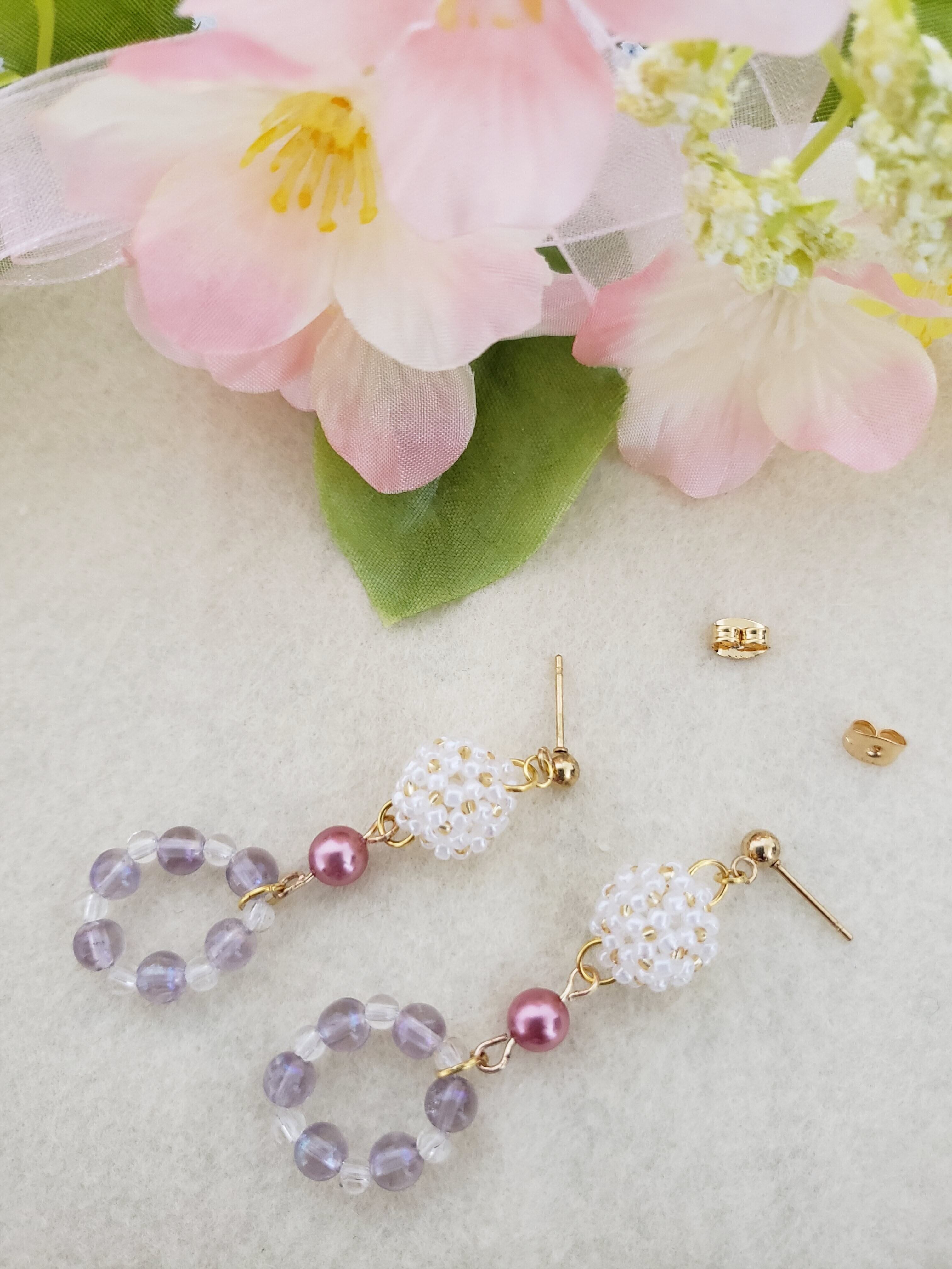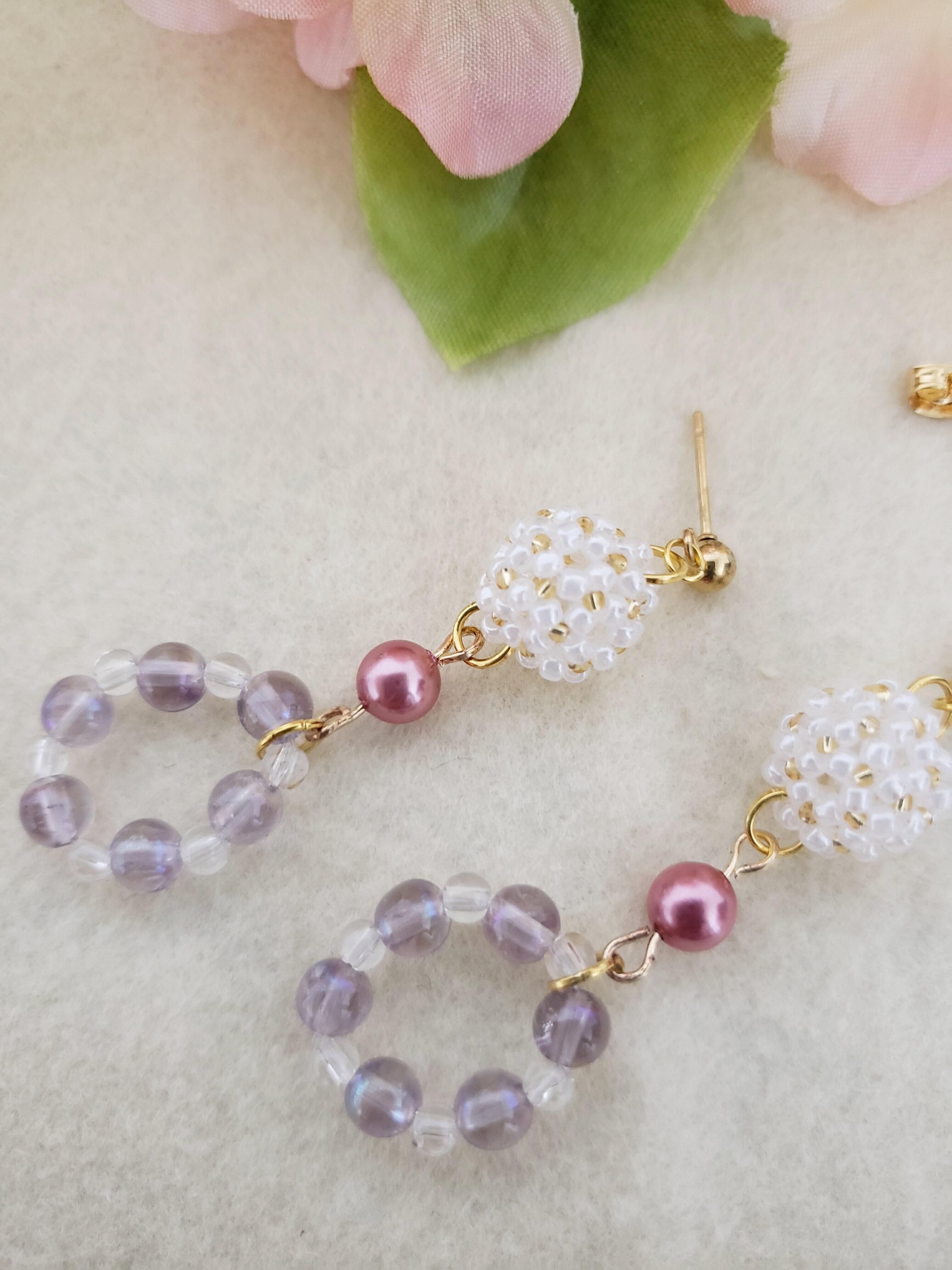 シ-ドビ-ズのボ-ル形に人気の天然石ラベンダーアクアオ-ラ&水晶の可愛らしいチャ-ムをつけたピアス♪
