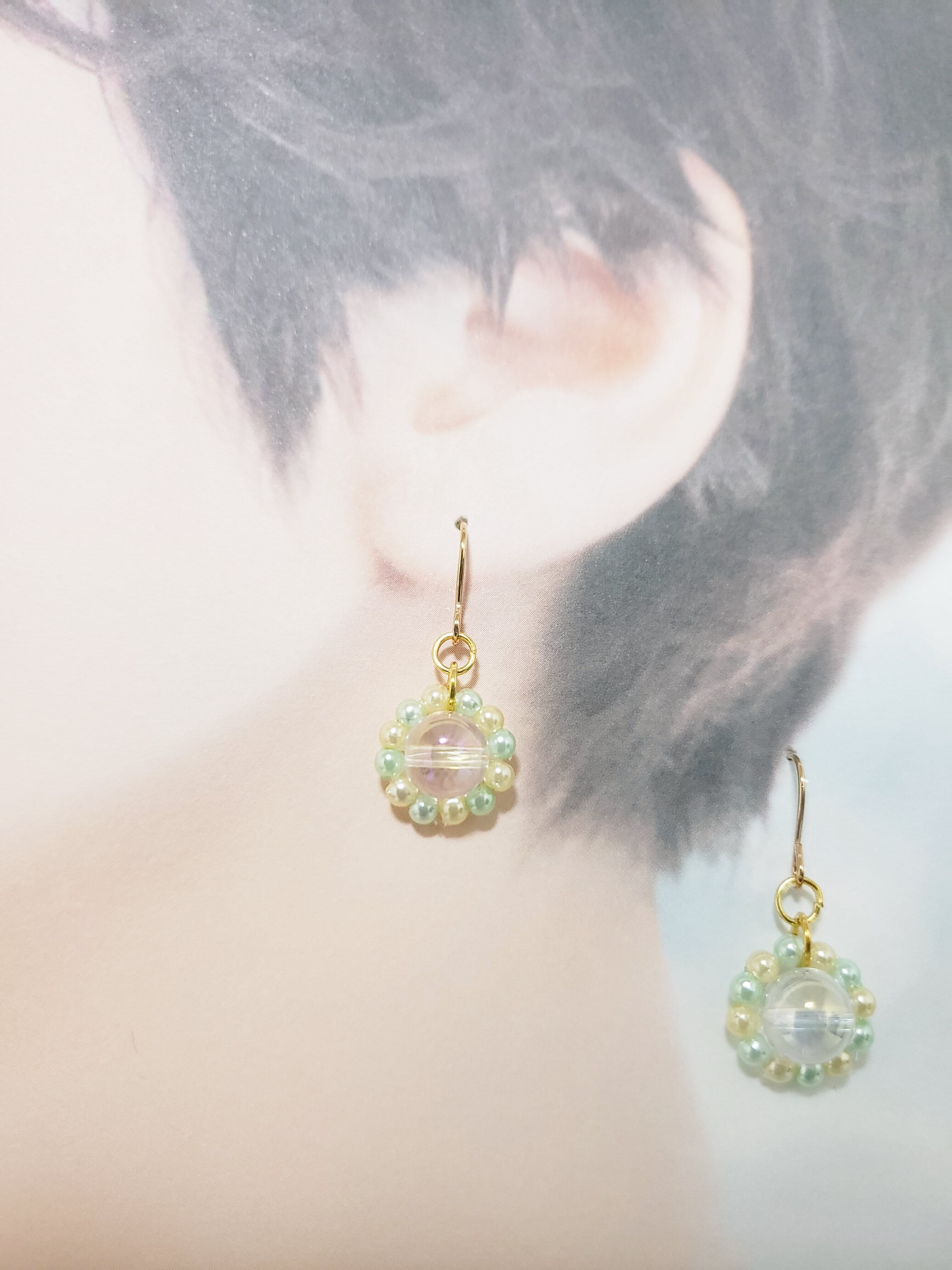 ♡1粒天然石のフラワーピアス♡コスモオ-ラ クリームイエロー&グリーン