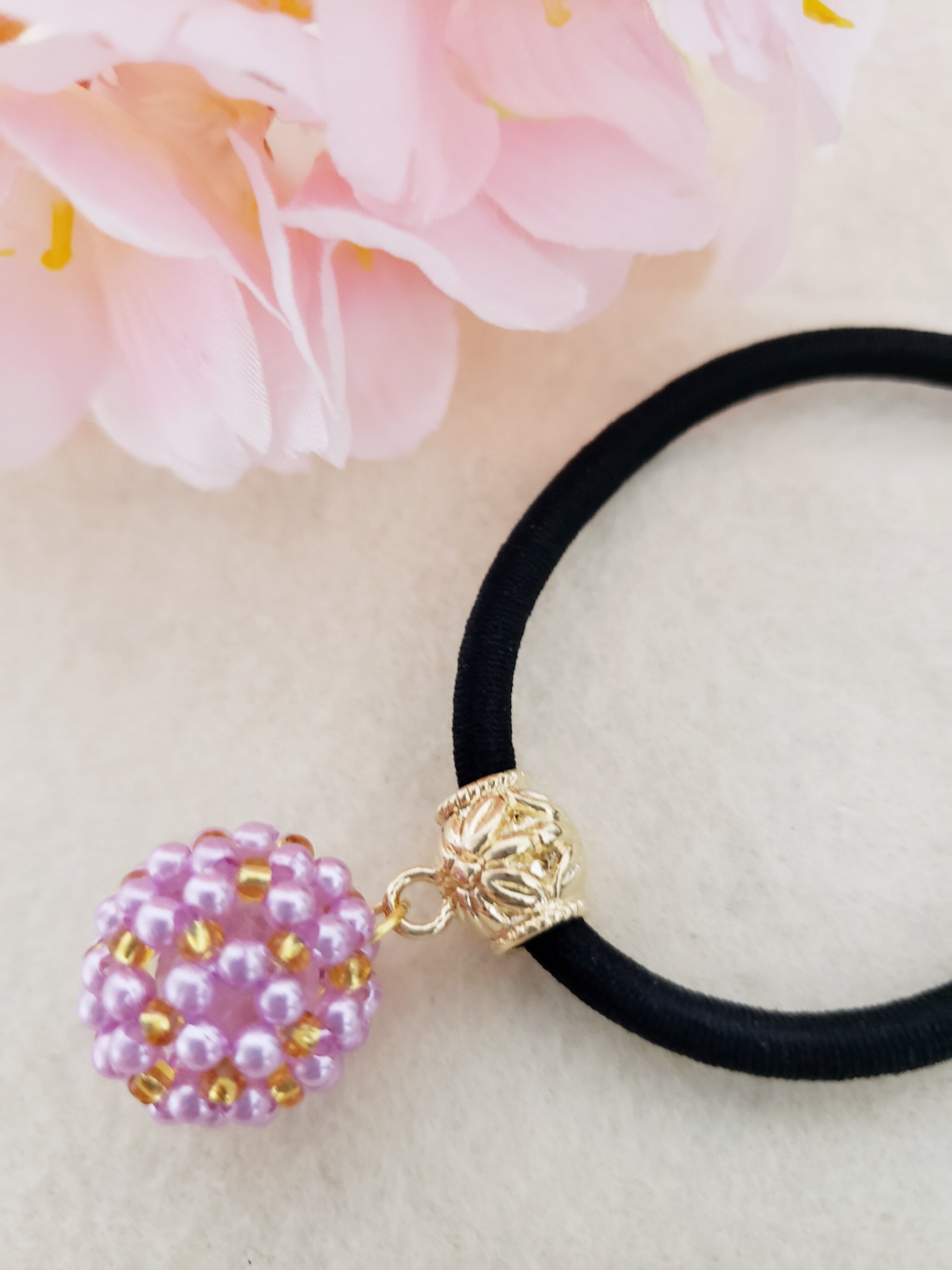 天然石水晶が入ったフラーレン形付きのヘアゴム☆