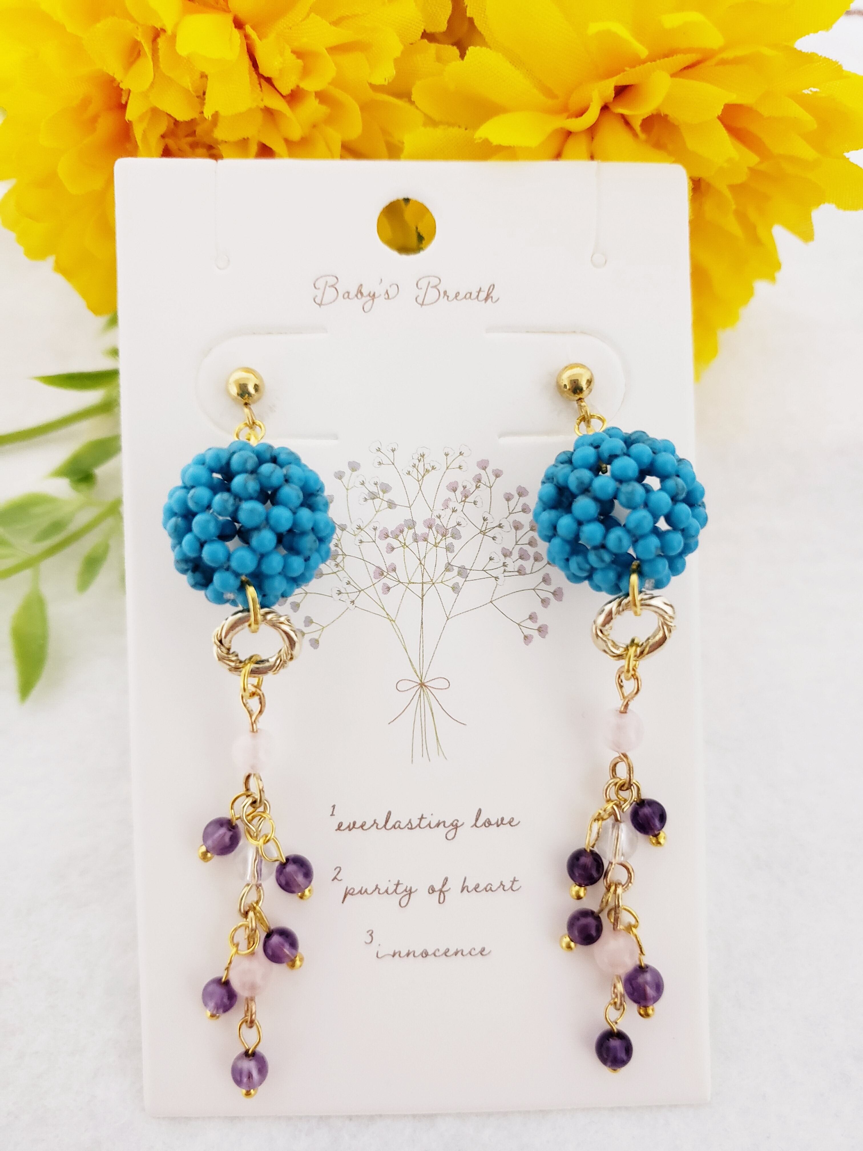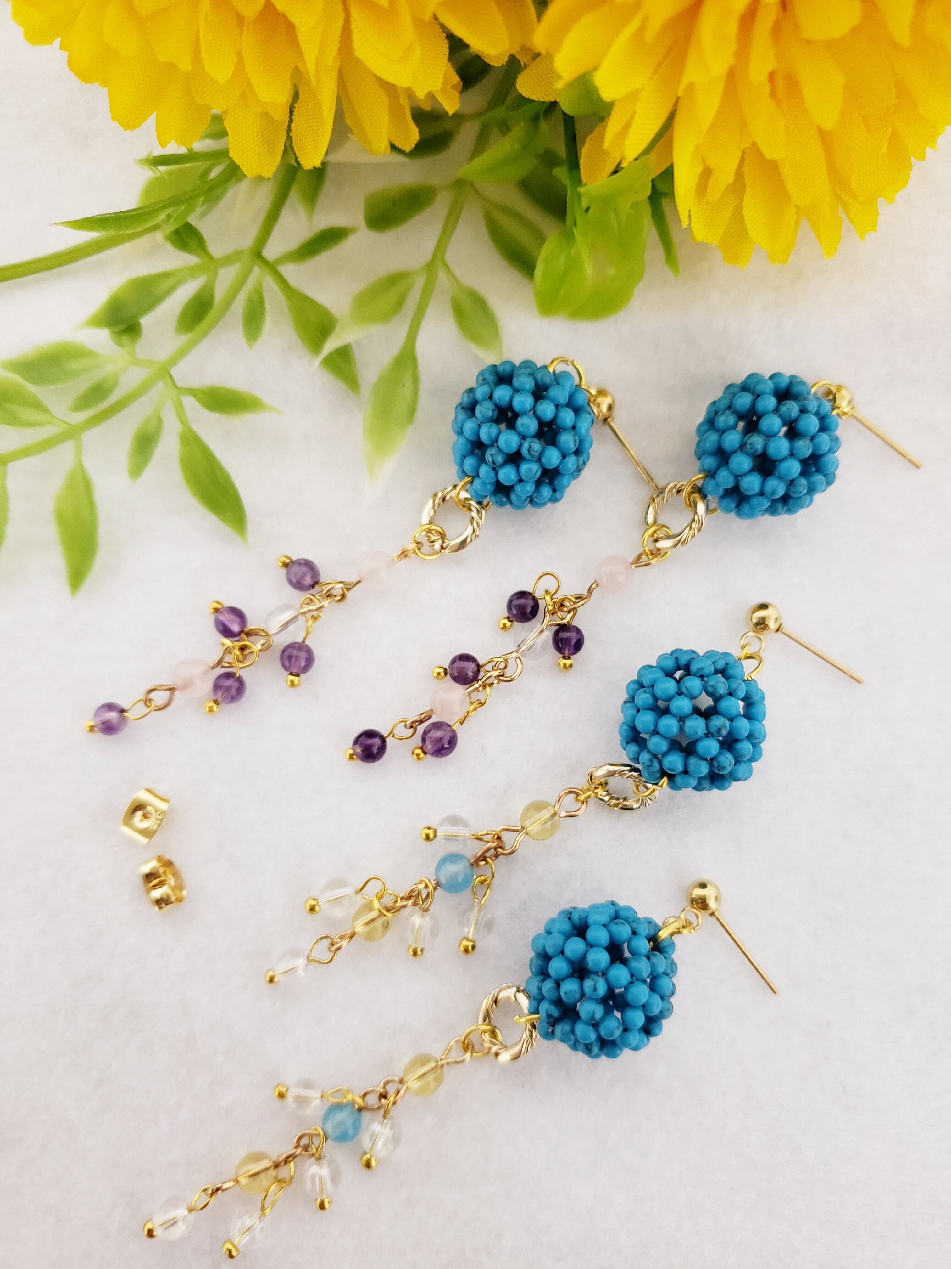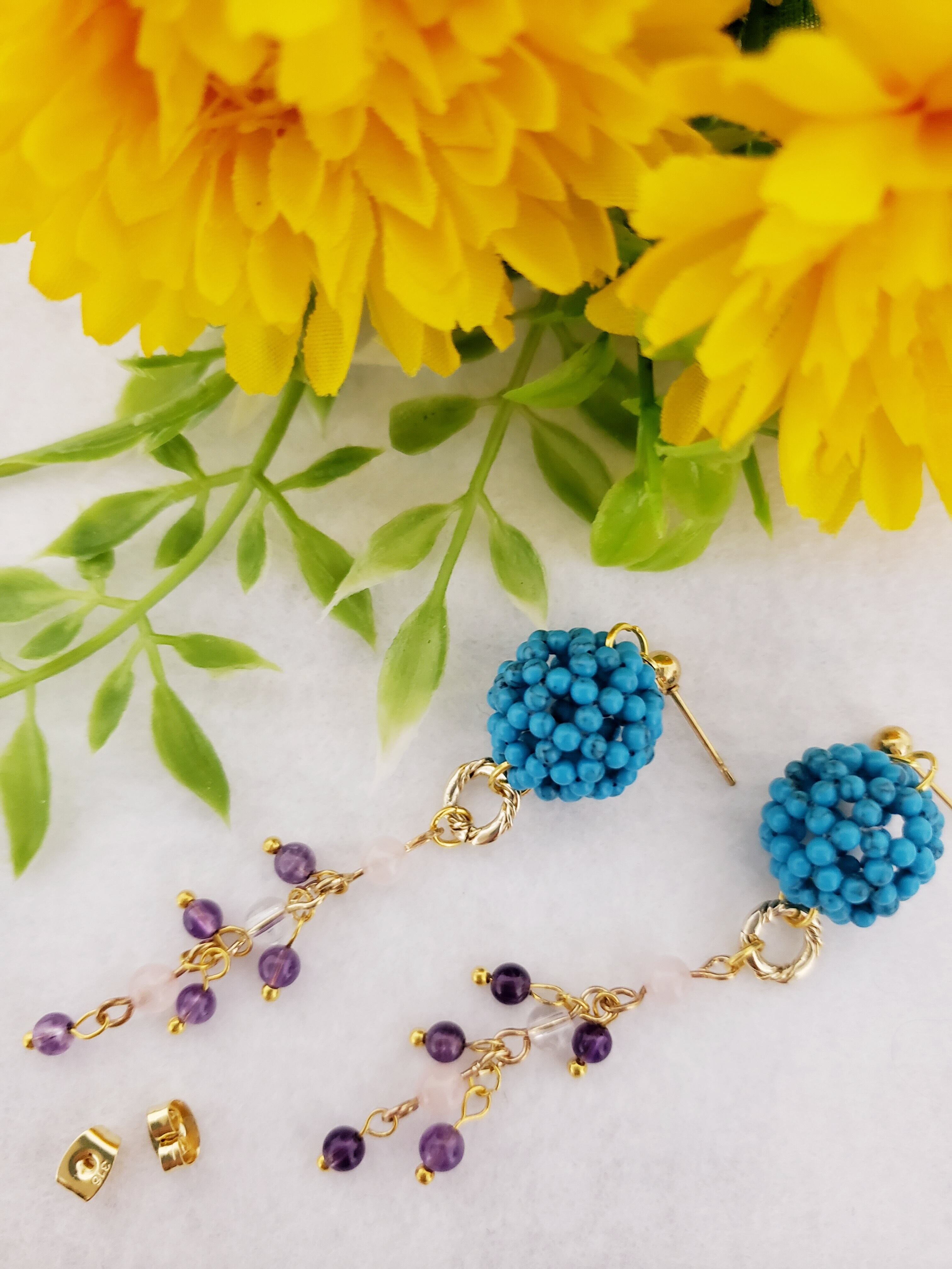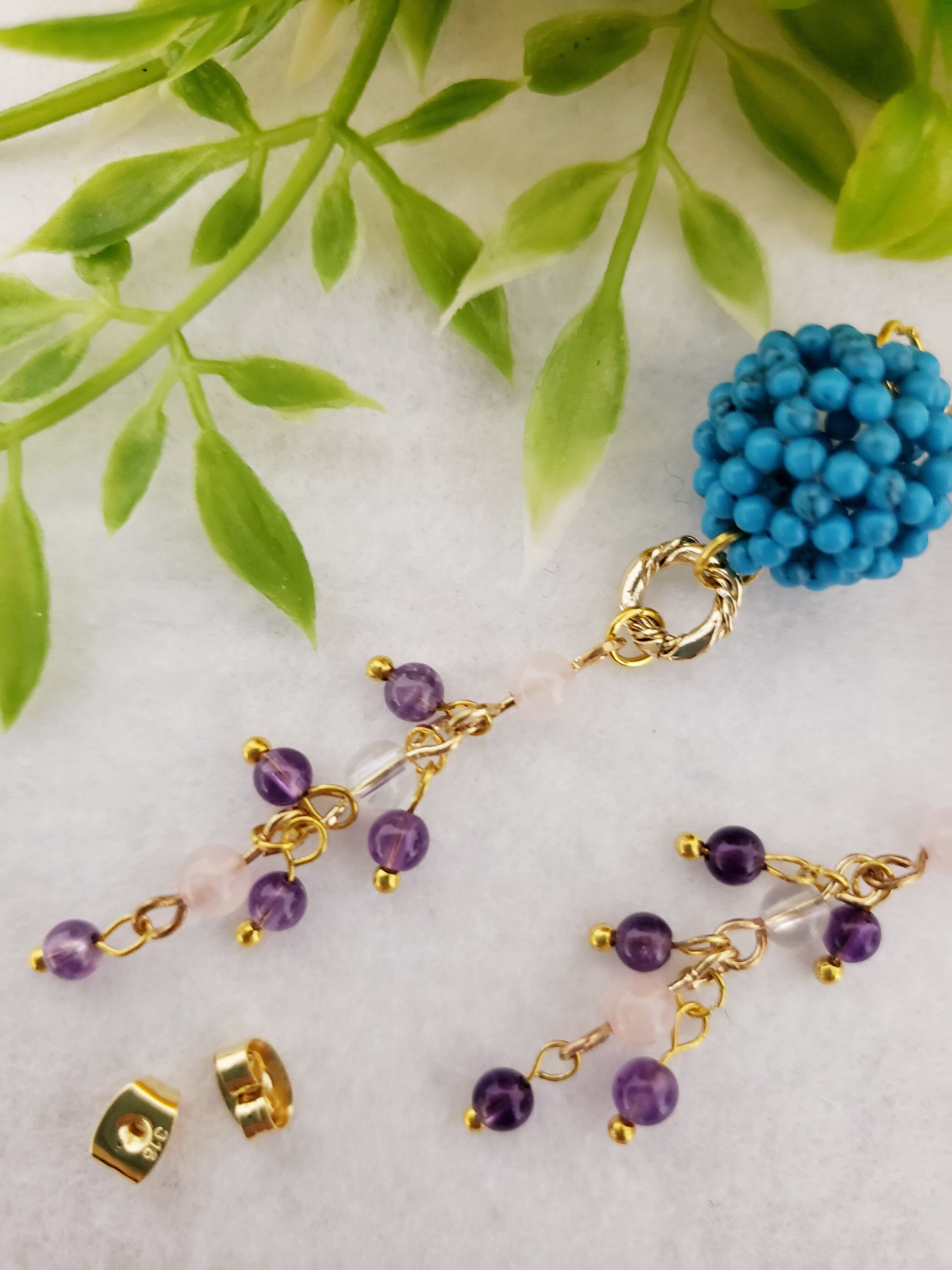 神聖幾何学フラーレン/タ-コイズ ロ-ズクォ-ツ&水晶&アメジストゆらピアス